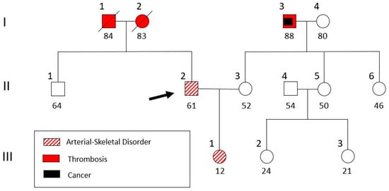 The discovery of an aortic aneurysm in a location other than the aortic root raised doubts about the initial diagnosis of Marfan syndrome, and the patient was referred to a clinical geneticist. The family history taken (Figure 4) revealed that the patient (II-2) has a daughter (III-1) with a similar phenotype (tall and lean stature, a high-arched palate, crowded teeth, and arachnodactyly) and, furthermore, debutant scoliosis and divergent strabismus. The patient’s parents (I-1 and I-2) both had a history of non-specified thrombosis (Figure 4). After genetic counseling and informed consent, a blood sample was extracted from the patient for genomic DNA analysis. The study was approved (RPURI9002) by the Bioethics Committee of the University Research Institute of Maternal and Child Health and Precision Medicine at the School of Medicine of the National Kapodistrian University of Athens.
