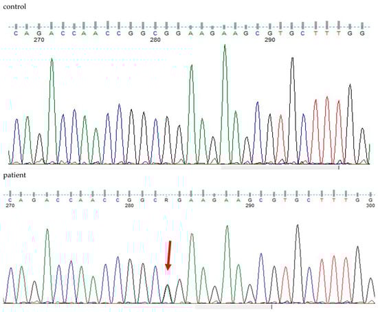 WES analysis of thousands of genes (including TGFB2, TGFB3, TGFBR1, IPO8, SMAD2, and SMAD3) detected a deleterious heterozygous missense pathogenic variant NM_003238.6 (TGFB2):c.896G>A (p.Arg299Gln). Sanger sequencing confirmed the finding (Figure 5), and the diagnosis of Loeys-Dietz syndrome type 4 (LDS4) was established for the patient, as the disorder is apparently caused by a de novo dominant pathogenic variant in the TGFB2 gene. The patient’s daughter was also a heterozygote for the observed pathogenic variant, which is pathogenic (ƒ = 0.000000684) and has been previously detected in another LDS4 patient [21].