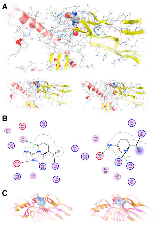 Our molecular modeling study highlighted the fact that the change of the arginine (Arg) to a glutamine (Gln) residue indeed had significant effects on the structure and function of the protein, as the location of these residues is involved in critical interactions within the protein. Arginine and glutamine have different chemical properties. Arginine is a positively charged amino acid with a long, flexible side chain, while glutamine is uncharged with a shorter side chain. When an arginine residue that plays a crucial role in stabilizing the protein structure or in binding to other molecules is changed to glutamine, it can disrupt these interactions and alter the protein’s three-dimensional structure (Figure 6A). The wild-type of arginine residue is involved in forming salt bridges or hydrogen bonds with nearby amino acids or other molecules; substituting it with glutamine, which lacks the positive charge of arginine, would weaken or abolish these interactions. This disruption can lead to misfolding of the protein or loss of its functional properties. The arginine residue interacts via metal/ion contact with Asp315 and Thr268 via hydrogen bonding. The glutamine residue lost both of these vital interactions; on the contrary, it established hydrogen bonds to Asp329 and Arg362 because its side chain is shorter than arginine’s side chain (Figure 6B). Moreover, the vital positive charges of the arginine residue have migrated and were significantly weakened by the introduction of the glutamine residue, as can be deduced by the electrostatic cloud representations for these two residues in the proximity of the protein (Figure 6C).