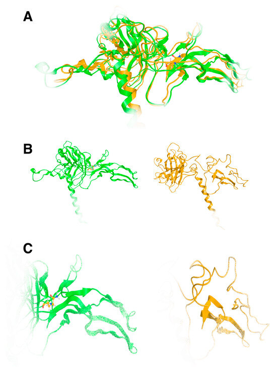 The effect of the arginine (R) to glutamine (Q) variant was investigated by exhaustive molecular dynamics simulations. It was shown that the structure of the mutated protein changes significantly upon MDs (Figure 7). Structural integrity refers to the ability of a molecule or system to maintain its structure and function under different environmental or physical stresses. For biological molecules such as proteins, DNA, or membranes, structural integrity is crucial for their proper function. Any loss of structural stability can lead to dysfunction, which is often associated with diseases. Similarly, for synthetic materials or nanostructures, maintaining structural integrity is essential for their performance and reliability in applications. By simulating the motions of atoms over time, MD can elucidate how pathogenic variants influence the overall conformation, folding, dynamics, and interactions of proteins. These simulations reveal changes in secondary and tertiary structures, alterations in dynamic behavior and flexibility, and modifications in intra-protein and protein-ligand interactions. Moreover, MD simulations provide insights into how pathogenic variants affect binding affinities and water dynamics within the protein’s environment. Wild-type and mutant protein dynamics comparison in molecular dynamics simulations involves studying the differences in behavior between the natural (wild-type) version of a protein and its altered (mutant) form. By simulating both versions, researchers can analyze how pathogenic variants affect the stability, flexibility, and overall structural integrity of the protein. These comparisons often reveal changes in folding, intermolecular interactions, or regions of increased flexibility in the mutant protein. Such insights are critical for understanding the functional consequences of pathogenic variants, especially in the context of diseases, and can guide drug design or protein engineering efforts (Figure 7 and Figure 8). The two structures were then superposed, and it became obvious that there was quite a lot of conformational rearrangement in the mutated protein (Figure 8A). Interestingly, a series of b-sheets was completely lost in the mutated protein (Figure 8B,C). This is a clear effect of the pathogenic variant that resulted in a conformational change, structural compromise, and, thus, loss of function. Substituting the arginine with glutamine indeed impacted the three-dimensional structure of the protein, potentially affecting its function and leading to various biological consequences.