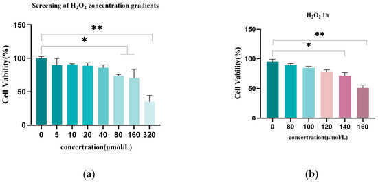 GCs obtained through isolation were plated into 96-well culture dishes and cultured under standard conditions (37 °C and 5% CO2). Following a 12 h attachment period, a systematic evaluation of H2O2 concentration gradients through experimental assays was implemented. For the control group, 0 μmol/L H2O2 was added; for the experimental groups, 5, 10, 20, 40, 80, 160, or 320 μmol/L H2O2 (diluted with complete medium) was added to treat the cells. The appropriate concentration range was determined by assessing cell viability and further screening was conducted to identify the optimal treatment concentration and duration within this range.