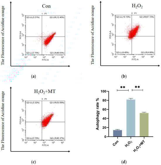 MT alleviates H2O2-induced mitochondrial damage in GCs. Acridine orange staining and flow cytometry were used to detect acidic autophagic vacuoles within the cells. (a–c) The flow cytometry plot shows the X-axis representing the FITC channel signal (green fluorescence) and the PC5.5 channel signal (red fluorescence). The density of the red scatter points reflects the change in the count of autophagic vacuoles in the cells. After H2O2 treatment, the fluorescence signal significantly increased, while MT treatment reduced the signal intensity. (d) JC-1 staining was used to assess the mitochondrial membrane potential (ΔΨm) by flow cytometry. The X-axis represents the FITC channel (green fluorescence) and the Y-axis represents the PE channel (red fluorescence). (e–g) The autophagy rate is represented by the sum of the values in the Q2-UL and Q2-UR quadrants. (h) The JC-1 red-to-green fluorescence ratio (G/R) of different treatment groups is shown to reflect changes in mitochondrial membrane potential. The experiment was conducted in triplicate, with data shown as mean ± SEM. ** p < 0.01.