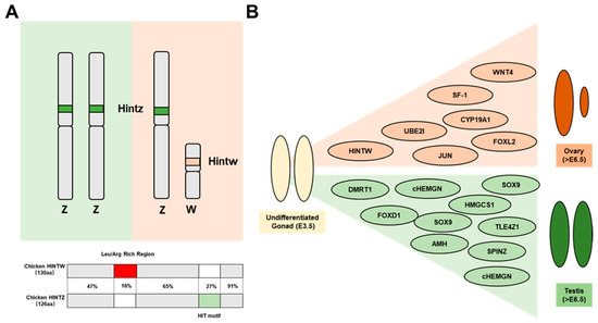 - Nagai, H.; Sezaki, M.; Bertocchini, F.; Fukuda, K.; Sheng, G. HINTW, a W-chromosome HINT gene in chick, is expressed ubiquitously and is a robust female cell marker applicable in intraspecific chimera studies. Genesis 2014, 52, 424–430. [Google Scholar] [CrossRef]