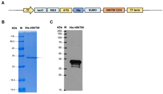 The construction and identification of the pET-SUMO-HINTW: (A) The map of pET-SUMO-HINTW plasmid. (B) Coomassie brilliant blue staining to detect the expression of His-HINTW fusion protein. The red arrow points the His-HINTW protein. (C) Western blot detects the size of His-HINTW fusion protein.