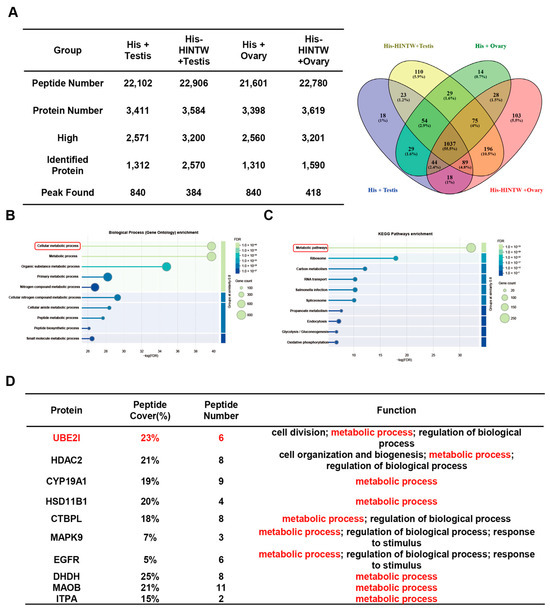 Mass spectrometry analysis was performed to compare and detect the interacting proteins obtained from the pull-down assay. Different numbers of peptides were identified in various experimental groups, and further identification revealed specific proteins, indicating that the HINTW protein can perform its function in the ovary by interacting with different proteins (Figure 4A, Tables S1 and S2). Further functional analysis of HINTW-binding proteins in the ovary showed that the pathways and expression patterns of these differential proteins (UBE2I, HDAC2, CYP19A1, HSD11B1, CTBPL, MAPK9, EGFR, DHDH, MAOB and ITPA) were significantly enriched in metabolic pathways (Figure 4B,C, Tables S3 and S4). Additionally, the analysis of proteins within the metabolic pathways revealed that the UBE2I protein interacts with the HINTW protein in the ovary, suggesting that HINTW is likely to participate in the female sex determination process in chick embryos by interacting with UBE2I (Figure 4D).