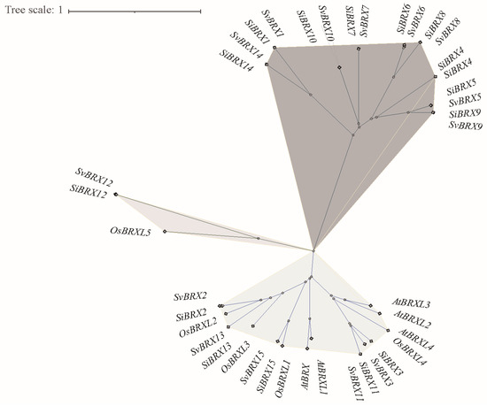 The analysis utilizing BLASTP was performed with acid sequences derived from Arabidopsis and rice to pinpoint BRX family genes within foxtail millet, applying an E-value cutoff of 10−5 [20]. This investigation was executed utilizing genomic references of green foxtail (Setaria viridis v2.1) and foxtail millet (Setaria italica v2.2) available in the Phytozome database (https://phytozome-next.jgi.doe.gov; accessed 1 December 2024) [21]. Moreover, the existence of the BRX domain (PF08381; E-value cutoff of 0.001) [22] within these sequences was further validated using PFAM 37.0 (https://pfam.xfam.org; accessed on 1 December 2024) [23]. Furthermore, various physical and chemical characteristics of the foxtail millet BRX proteins, such as amino acid composition, theoretical isoelectric point, molecular weight, aliphatic index, instability index, and grand average of hydropathicity, were calculated using ExPASy (https://www.expasy.org; accessed 1 December 2024). The prediction of subcellular localization for SiBRXs and SvBRXs was performed through the WoLF PSORT tool (https://www.genscript.com/wolf-psort.html; accessed on 1 December 2024) [24]. The members of the foxtail millet BRX gene family were designated according to their chromosomal arrangement.