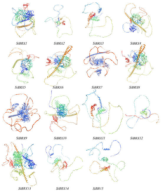 The function of a gene is closely linked to the structure of the protein it encodes. Homology modeling is used to predict the three-dimensional (3D) structure of a protein based on its amino acid sequence. The 3D structures of 15 SiBRX proteins were predicted using experimentally determined structures as templates. As shown in Figure 4, the 3D models of all 15 genes included both β-sheets and α-helices. The 3D structures of SiBRX1, SiBRX4, SiBRX5, SiBRX6, SiBRX7, SiBRX8, SiBRX9, SiBRX10, and SiBRX13 included a ring-like structure composed of β-folds, and all SiBRX protein structures were surrounded by disordered loop structures.