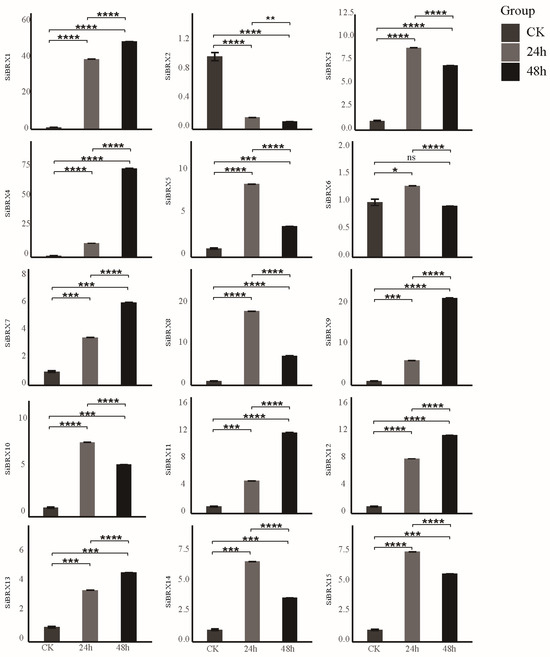 Expression profiles of SiBRX genes after 24 h and 48 h under drought stress. Error bars represent the SE of three biological replicates. Bars marked with asterisks (ns: non-significant, * p < 0.05, ** p < 0.001, *** p ≤ 0.0001, **** p ≤ 0.00001) indicate statistically significant difference by Student’s t-test.