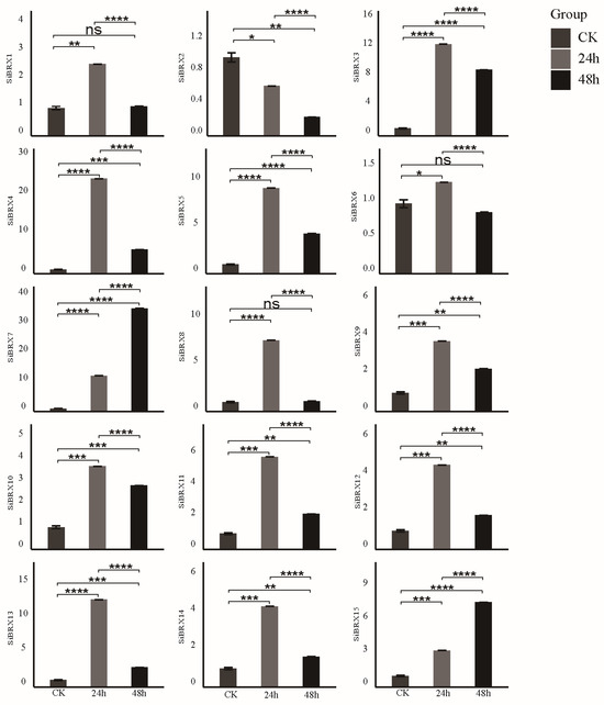 Expression profiles of SiBRX genes after 24 h and 48 h under salt stress. Error bars represent the SE of three biological replicates. Bars marked with asterisks (ns: non-significant, * p < 0.05, ** p < 0.001, *** p ≤ 0.0001, **** p ≤ 0.00001) indicate statistically significant difference by Student’s t-test.