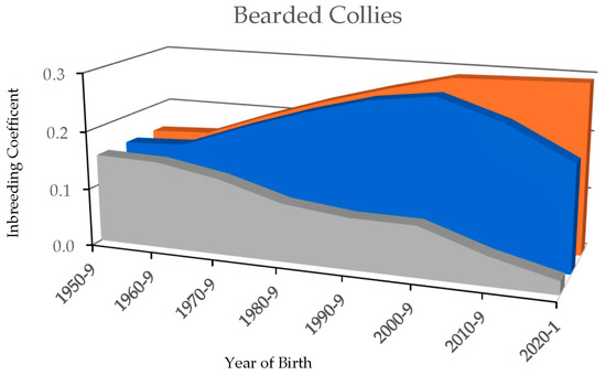 The longer segments of ROH in the Bearded Collie would suggest that the observed inbreeding reflects recent inbreeding practices [47,102] supported by a rise in overall inbreeding in the most recent time frames. As noted above, inbreeding coefficients will also rise with concerted efforts to purge deleterious and undesirable alleles [14], which may be the case with the Bearded Collie. Historically, the first specific reference to the Bearded Collie as a distinct breed name was in 1891, with litters registered in the early 1900s [103], and the breed was recognized by The Kennel Club in the UK in 1959 [104]. The inbreeding data, aligning with the historical accounts, suggest that prior to the 1930s, the Bearded Collie was inbred at a level equivalent to a mixed-breed dog and likely lacked the cohesion expected of a purebred dog. The degree of inbreeding and loss of heterozygosity is a rather recent phenomenon as evidenced by the ROH and LD decay data. Other pedigree dog breeds having a longer historical background, such as the Dalmatian, exhibit a similar pattern of inbreeding [64] suggesting 20th-century breeding practices to refine breed characteristics spanned across the breeds resulting in similar levels of homozygosity, albeit in breed-specific patterns.