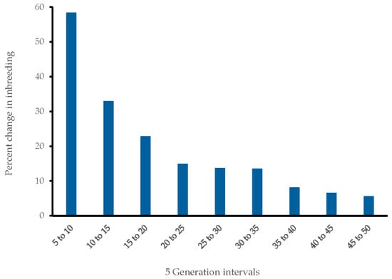 Percent change in inbreeding (∆F) per generation interval over time starting with the most recent interval from 5 to 10 generations ago.