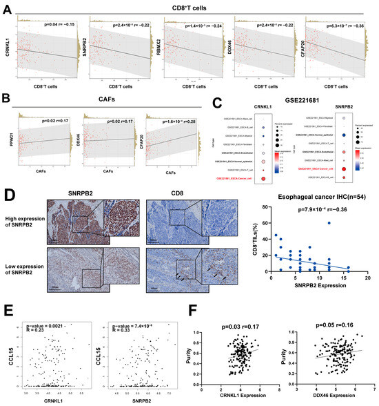(A) Negative correlation between survival-related splicing factors (SFs) and levels of tumor-infiltrating CD8+ T cells. (B) Positive correlation between survival-related SFs and cancer-associated fibroblasts (CAFs). (C) Aberrant expression of survival-related splicing factors (SFs) in cancer cells shown by single-cell RNA sequencing. (D) Negative correlation between SNRPB2 expression and tumor-infiltrating CD8+ T cells, based on immunohistochemical (IHC) staining. Arrows indicate tumor-infiltrating CD8+ T cells. (E) Positive correlation between survival-related SFs and representative chemokines. (F) Positive correlation between survival-related SFs and tumor purity.