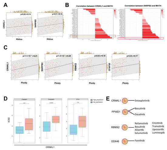 (A) Positive correlation between survival-related SFs and cancer stemness, as assessed by RNAss estimation. (B,C) Positive correlations between survival-related SFs and MATH (B) and ploidy (C). (D) Representative splicing factor CRNKL1 is correlated with resistance to cisplatin, oxaliplatin, and 5-fluorouracil in esophageal cancer. (E) Survival-related SFs are associated with resistance to tyrosine kinase inhibitors.