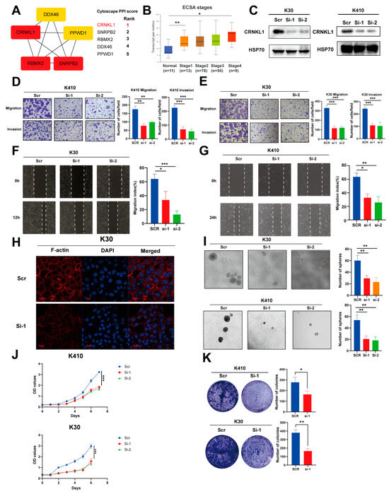 (A) Identification of hub survival-related splicing factors (SFs) using Cytoscape PPI score. (B) Correlation between CRNKL1 expression and clinical stages of esophageal cancer (ESCA). (C) Validation of CRNKL1 knockdown in KYSE30 and KYSE410 cells by Western blotting. (D–G) CRNKL1 knockdown significantly impairs cell migration in KYSE30 and KYSE410 cells, as demonstrated by transwell assays (D,E) and wound healing assays (F,G). (H) CRNKL1 knockdown significantly affects cytoskeleton remodeling in KYSE30 cells. (I) CRNKL1 knockdown significantly impairs cancer stemness in KYSE30 and KYSE410 cells, as demonstrated by tumor sphere formation experiments. (J,K) CRNKL1 knockdown significantly affects tumor proliferative ability, as indicated by proliferation curves (J) and colony formation assays (K). * p < 0.05, ** p < 0.01, *** p < 0.001.