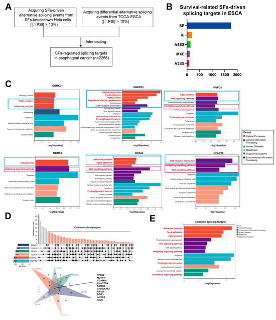 (A) Workflow for deciphering SFs-driven esophageal cancer-specific splicing targets. (B) Statistics of survival-related SFs-driven splicing targets in ESCA. (C) KEGG enrichment analysis of pathways enriched in SF-driven splicing targets. Blue and red rectangles showed cytoskeletal pathways and stemness cell pathways. (D) Common splicing targets driven by survival-related SFs in esophageal cancer. (E) KEGG enrichment analysis of common splicing targets.