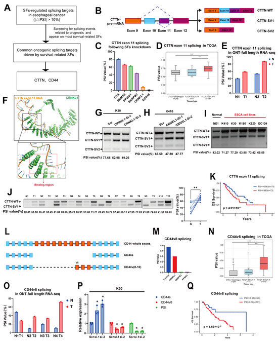 (A) Workflow for exploring common downstream splicing targets in ESCA. (B) Alternative splicing (AS) of CTTN exon 11 and its different isoforms. (C–E) Changes in CTTN exon 11 AS in SFs-knockdown HeLa cells (C), the TCGA database (D), and full-length RNA-seq of paired ESCA tissues (E). (F) AlphaFold3-predicted interaction between CRNKL1 and CTTN exon 11 RNA. (G–J) Knockdown of CRNKL1 significantly promotes CTTN exon 11 skipping in KYSE30 (G) and KYSE410 (H) cells; conversely, CTTN exon 11 inclusion was observed in both ESCA cell lines (I) and clinical specimens (J). (K) CTTN exon 11 inclusion is significantly correlated with poor prognosis in ESCA. (L) Illustration of different CD44 isoforms. (M–O) Changes in CD44v8 AS in SFs-knockdown HeLa cells (M), the TCGA database (N), and full-length RNA-seq of paired ESCA tissues (O). (P) Knockdown of CRNKL1 significantly promotes CTTN exon 11 skipping in KYSE30 cells. (Q) CD44v8 inclusion significantly correlated with poor prognosis in ESCA. * p < 0.05, ** p < 0.01, *** p < 0.001.