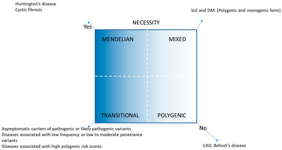 There has been an explosion in the volume of genomic information over the last two decades. We have proposed genetically transitional disease (GTD) as a new concept to supplement the traditional binary classification of human genetic disease as monogenic or polygenic/genetically complex [1]. GTD refers to disease, disease status, or cases, where a gene mutation is necessary but insufficient to cause disease alone. GTD emphasizes the pervasive impact of genetic background along with the environment. Like a broad wavelength band, polygenic diseases encompass a wide range of human diseases based on genetic impact, e.g., type 2 diabetes mellitus with a weak genetic effect to Crohn disease with a larger effect [2]. GTD straddles the intermediate gray zone between monogenic and polygenic diseases and also narrows and fine-tunes the band of the latter diseases. GTD was previously exemplified with four scenarios: (1) asymptomatic carriers of a monoallelic variant in a Mendelian recessive disease (e.g., cystic fibrosis); (2) asymptomatic carriers of a pathogenic or likely pathogenic variant in Tier 1 genetic conditions (e.g., familial hypercholesterolemia); (3) diseases associated with low-to-moderate penetrance variants in variable expressivity of rare conditions (e.g., cryopyrin-associated periodic syndrome; (4) diseases associated with moderate-to-high polygenic risk scores [1,2]. Based on presumed genetic impact, GTD and its related working nosology [1] is summarized in Table 1 and Figure 1. In addition to monogenic, GTD, and polygenic disease, there is a genetically mixed form, where both polygenic and monogenic explanations for a disease may be appropriate, e.g., maturity onset diabetes of the young (MODY), in the category of diabetes [3].