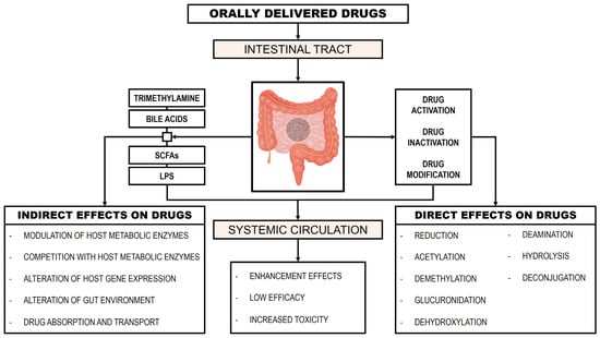 However, the majority of orally administered hydrophilic drugs migrate from the upper to the lower intestinal tract, where the GM metabolizes them into hydrophobic metabolites. This transformation facilitates their absorption from the gastrointestinal tract into the bloodstream []. Figure 2 presents the influence of the GM on drug metabolism (modified from []).