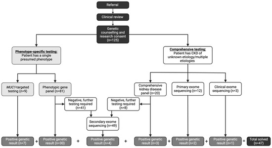 - Schott, C.; Arnaldi, M.; Baker, C.; Wang, J.; McIntyre, A.D.; Colaicovo, S.; Relouw, S.; Offerni, G.A.; Campagnolo, C.; Nyatten, L.R.V.; et al. Implementation of a kidney genetic service into the diagnostic pathway for patients with chronic kidney disease in Canada. Kidney Int. Rep. 2025, 10, 574–590. [Google Scholar] [CrossRef] [PubMed]