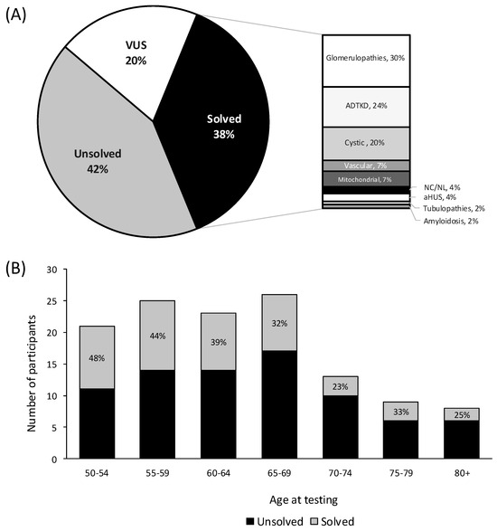 Diagnostic yield of chronic kidney disease patients ≥ 50 years of age at time of genetic testing. (A) Overall diagnostic yield (B) Diagnostic yield stratified by age at genetic testing. Participants are either solved with a pathogenic variant, which has definitive evidence of disease causation, or likely pathogenic which have strong but not absolute evidence (>90% certainty) and are both considered diagnostic in clinical genetics [23]. Unsolved participants can either have a VUS (variants of uncertain significance), or no identified variants. Abbreviations: atypical hemolytic uremic syndrome (aHUS), autosomal dominant tubulointerstitial kidney disease (ADTKD), and nephrocalcinosis and nephrolithiasis (NC/NL).