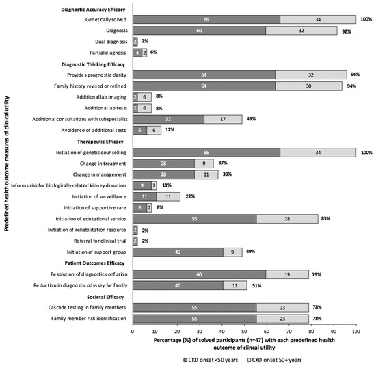 Clinical utility in solved participants (n = 47). Clinical utility is determined by predefined health outcomes, modified from Hayeems et al. [24]. The dark gray represents patients diagnosed with CKD before the age of 50, light gray represents those diagnosed at 50 years or older. The numbers within each bar represent the percent of solved patients with that health outcome for each age group, and the percent at the end of the bar represents the overall percentage of solved patients with the health outcome.