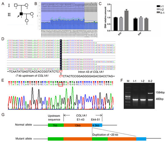 Identification of a novel gross duplication in Family PUMC-OI-110. (A) Pedigree structure of the family. Note: arrow, proband; solid square, OI patient. (B) A duplication spanning exons 1–43 of COL1A1 was detected in the proband by MLPA analysis; The normalized probe ratio thresholds were defined as follows: diploid (black circles; 0.7 ≤ ratio ≤ 1.3) and duplication (yellow circles; ratio >1.3). (C) The duplication identified in the proband via MLPA was validated in the core family (I-1, I-2, and II1) through quantitative analysis of exons 43 and 44 in COL1A1. (D) WGS read coverage of the breakpoint junction aligned with the 7 kb upstream region (left) and exon 43 (right) of COL1A1. (E) The breakpoint junction was validated by DNA Sanger sequencing. (F) Gap-PCR confirmed that the gross duplication was a de novel variant. (G) Schematic diagram of the gross duplication (chr17:48,286,224-48,265,650, hg19), and the green area represents a 7kb region upstream of COL1A1, the tangerine orange area encompasses exons 1 to 43 of COL1A1, and the blue area covers exons 44 to 51 of COL1A1.
