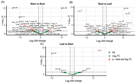 Volcano plots of differentially expressed miRNAs from pairwise comparisons of P. volubilis organ tissues. (A) Volcano plot of the stem vs. root comparison. (B) Volcano plot of the root vs. leaf comparison. (C) Volcano plot of the leaf vs. stem comparison.