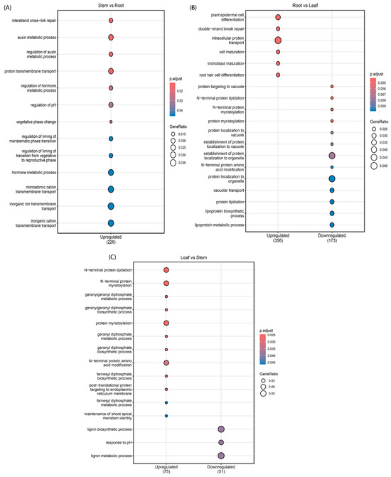 Dotplots displaying the results of the Functional enrichment (GO analysis) of the DE miRNA target genes in the three organ comparisons performed with ClusterProfiler. (A) GO enrichment analysis for DE miRNA target genes in stem vs. root (p < 0.05). (B) GO enrichment analysis for DE miRNA target genes in root vs. leaf (p < 0.06). (C) GO enrichment analysis for DE miRNA target genes in leaf vs. stem (p < 0.05). DE, differentially expressed; GO, gene ontology.