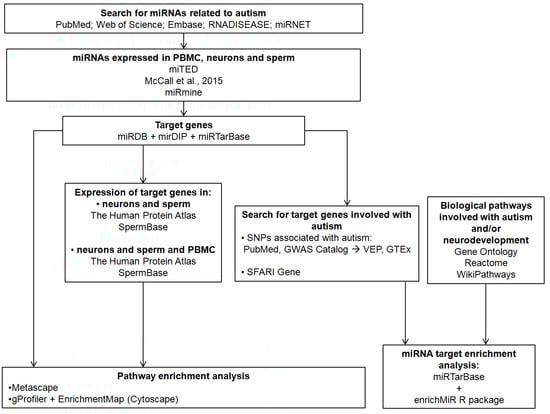 Autism-related miRNAs were obtained from miRNet version 2.0 [37] and RNADisease version 4.0 [38], and the PubMed, Web of Science, and Embase databases. Medical Subjective Heading terms related to autism and general terms referring to autism, such as “Autism spectrum disorder”, “Autistic disorder”, and “autism”, were used in combination with the terms “miRNA”, “microRNA”, and “sncRNA” (Table S1). The searches were carried out from December 2022 to February 2023. Non-experimental studies that analyzed previously published databases were also included.