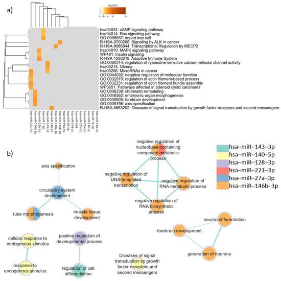 Pathway enrichment analysis for target genes expressed in common in sperm, neurons, and PBMCs. (a) Heatmap of enriched terms across miRNAs target genes list, produced by Metascape; (b) Enrichment map of enriched terms for miRNAs target genes lists created using EnrichmentMap in Cytoscape and gProfiler results.