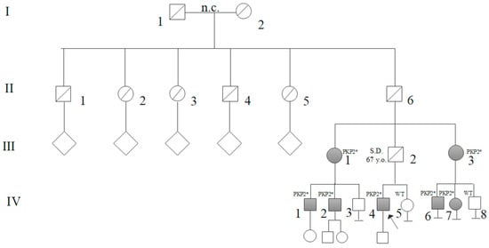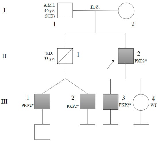 Family 2 pedigree: The proband’s father (III:2, obligate carrier of the variant) died at the age of 67 years due to Sudden Death (SD). All tested carriers of the PKP2 (NM_004572) variant (III:1; III:3; IV:1; IV:2; IV:4; IV:6; IV:7) are shown in grey and are indicated with PKP2* symbol. Segregation analysis resulted negative in patient IV:5 and IV:8, Wild-Type (WT). n.c.: non-consanguineous.