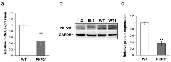 In order to verify the effect of the variant, PKP2 gene expression was estimated by RT-qPCR in PBMCs from three PKP2 variant carriers (Family 1; II:2; III:1; Family 2; III:1), belonging to both families and two Wild-Type (WT) controls. RT-qPCR showed that PKP2 expression levels were reduced in all three variant carriers compared with the two WT subjects. In particular, a mean reduction of 52% of PKP2 gene expression in patients carrying the variant (p = 0.007) was observed, suggesting that only the normal allele is expressed (Figure 3a). To find out the PKP2 expression at the protein level, the major isoform of PKP2A (92.7kDa) [15] was analyzed by Western blot (Figure 3b). As shown in Figure 3c, densitometric analysis underlines a statistically significant protein level reduction (** p < 0.01) in two variant carriers (Family 1; II:2; III:1) compared to WT (n = 2). This trend reflects the reduction of the relative gene expression obtained by RT-qPCR.