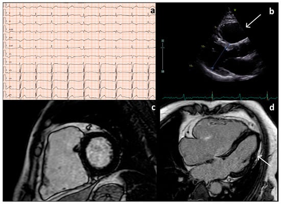 (a). EKG of II:2 (Family 1) shows sinus rhythm, first degree AV block, left posterior fascicular block, epsilon wave in D3, aVF and V1, and T wave inversion in D3, aVF, V3 to V4. (b). Transthoracic echocardiography parasternal long axis 2D of II:2 (Family 1) shows right ventricle enlargement (right ventricular outflow tract dimension: 40 mm), white arrow. (c,d). Cardiac magnetic resonance imaging (CMRI) of II:2 (Family 1) reveals in short axis (a) severe right ventricle enlargement (right ventricle end diastolic volume180 mL/m2), severe dysfunction (ejection fraction 22%), and right ventricle free wall microaneurysm; the long-axis 4-chamber view (b) shows the presence of subepicardial late gadolinium enhancement (LGE) involving the left ventricular in the apical lateral wall (white arrow).