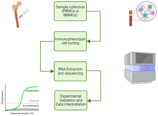 NGS workflow and ncRNA study. The NGS workflow for ncRNA study involves immunophenotyping cell sorting, RNA extraction and sequencing, differential expression analysis and experimental validation. This figure was created with BioRender (https://www.biorender.com, accessed on 15 March 2025).