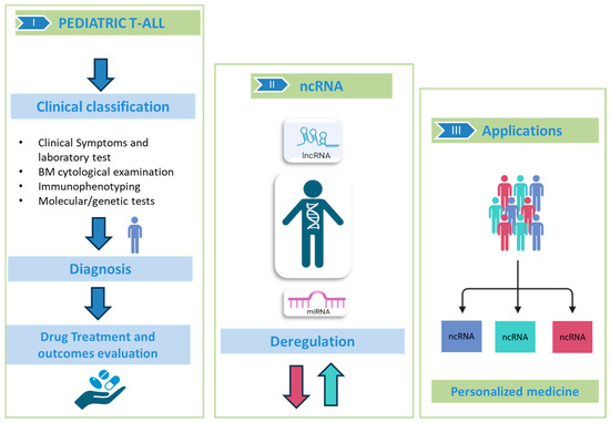 Although they do not encode proteins, miRNAs and lncRNAs can modulate various cellular functions that drive the malignant transformation of T-cell progenitors. The identification and study of deregulated ncRNAs could not only allow us to understand their role but also could allow for better patient stratification and the identification of alternative therapeutic strategies (Figure 2).