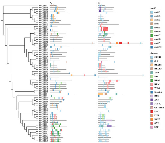 Phylogenetic relationships, motif composition, and domain analysis of rice CCCH genes. (A) Motifs of OsC3H proteins predicted by MEME, with different colors representing different motifs. (B) Domains of OsC3H proteins, with different colors indicating different domains.