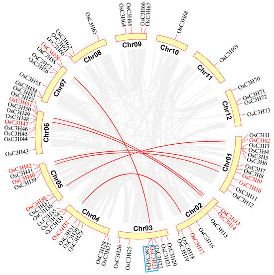 The visualization of OsC3H family genes was performed using TBtools v2.154 [29]. Synteny relationships within the rice genome and between rice (O. sativa) and other plant species, including Zea mays, Panicum virgatum, Triticum aestivum, Hordeum vulgare, A. thaliana, Glycine max, Brassica napus, Brassica rapa, Medicago truncatula, Solanum lycopersicum, Citrus clementina, Vitis vinifera, and Populus trichocarpa, were analyzed using the MCScanX plugin in TBtools [29].