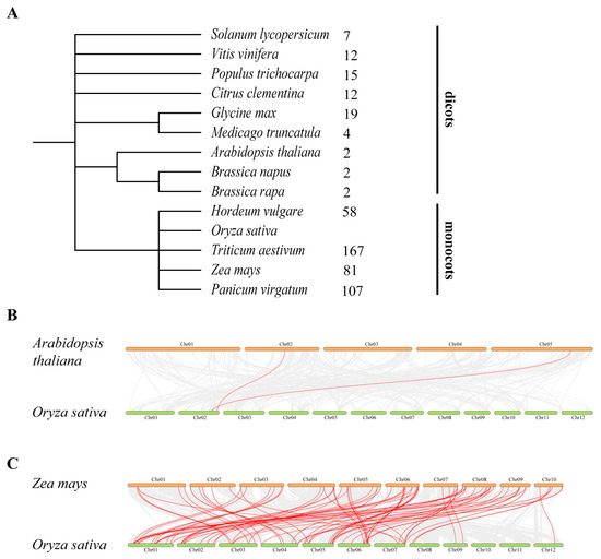 Phylogenetic relationships and synteny analysis of 14 Species. (A) Phylogenetic relationships among O. sativa, A. thaliana, Zea may, H. vulgare, G. max, S. lycopersicum, P. virgatum, T. aestivum, B. napus, B. rape, M. truncatula, C. clementine, V. vinifera, and P. trichocarpe, along with the number of homologous genes shared with rice from the other 13 species. (B) Synteny analysis between O. sativa and A. thaliana. The gray lines indicate collinear blocks between O. sativa and A. thaliana, and the red lines colinear gene pairs between O. sativa and A. thaliana. (C) Synteny analysis between O. sativa and Z. may. The gray lines indicate collinear blocks between O. sativa and Z. may, and the red lines colinear gene pairs between O. sativa and Z. may.