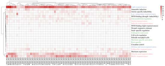 Number of cis-regulatory elements in rice OsC3Hs. Different font colors represent various types of elements. Blue, green, and red indicate stress response, tissue-specific expression, and plant growth regulators, respectively.