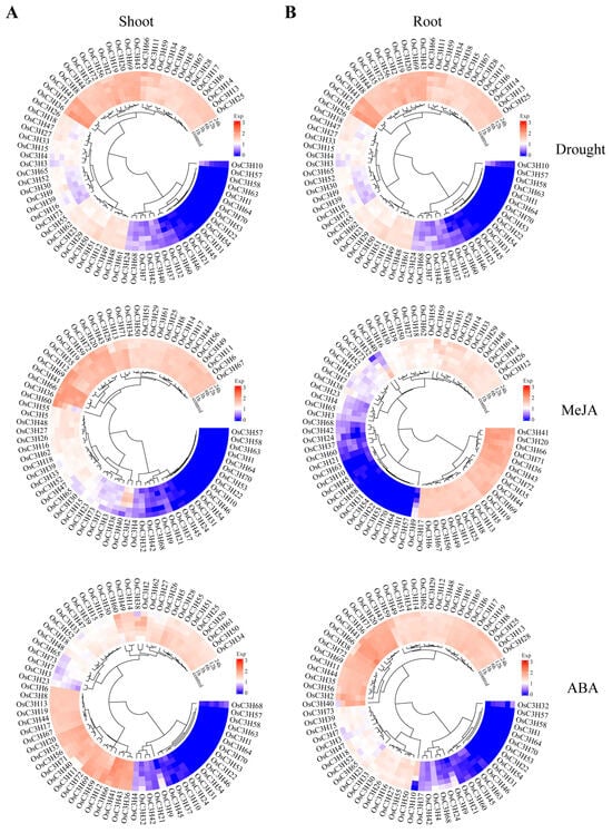 The analysis of tissue-specific expression profiles provided critical insights into the potential functions of genes in plants. Based on the expression data from six rice tissues, distinct expression patterns of OsC3H genes were observed (Figure 6). Genes in Group I exhibited high expression levels across all six tissues, whereas Group II genes showed moderate expression levels. In contrast, most genes in Group III displayed low or no expression in these tissues, although some exhibited notable tissue-specific expression. For instance, OsC3H10 was predominantly expressed in seeds, while OsC3H37 was specifically expressed in flowers. These findings suggest that different OsC3H genes may contribute to the development and function of specific rice tissues. In addition to tissue-specific expression, we analyzed the responses of OsC3H genes to drought stress and hormonal treatments with abscisic acid (ABA) and methyl jasmonate (MeJA). Expression levels were measured at six time points (0 h, 1 h, 3 h, 6 h, 12 h, and 24 h) in both shoot and root tissues (Figure 7). Under drought conditions, after 24 h, the expression of OsC3H5, OsC3H38, and OsC3H40 in the shoot increased by 10.71-, 9.05-, and 3.47-fold, respectively. In the root, OsC3H10 exhibited a remarkable 28.52-fold increase, despite being almost undetectable in the shoot. Similarly, during MeJA treatment, OsC3H40 expression increased significantly, by 22.12-fold in the shoot and 21.96-fold in the root, after 24 h. Additionally, OsC3H32 in the root exhibited a dramatic 45.98-fold increase. Following 24 h of ABA treatment, OsC3H40 expression increased by 3-fold in the shoot and 16-fold in the root. These results demonstrate that certain OsC3H genes are highly responsive to drought, ABA, and MeJA stress, with differential expression patterns between tissues. This highlights their potential roles in mediating stress responses and contributing to tissue-specific adaptive mechanisms in rice.