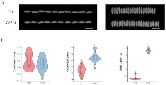 Based on the substitution lines previously constructed in our laboratory using 9311 as the recipient parent and Nipponbare as the donor parent [33], we screened for materials that matched the OsC3H36 haplotypes. We measured the grain length and width of 20 seeds and conducted five measurements of 1000-grain weight, followed by t-tests (p < 0.05).