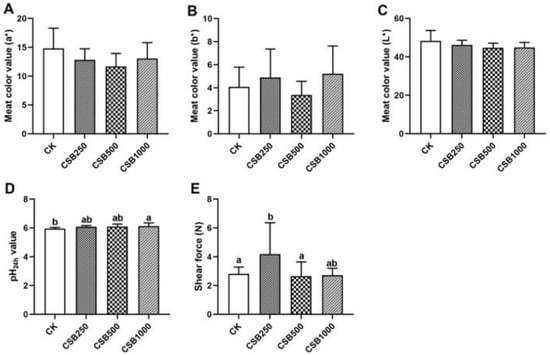 Effects of CSB supplementation on meat quality in broilers. (A) Meat color value (a*). (B) Meat color value (b*). (C) Meat color value (L*). (D) pH24h value. (E) Shear force. n = 6 for each group. a,b Means with different letters indicate statistically significant differences (p < 0.05).