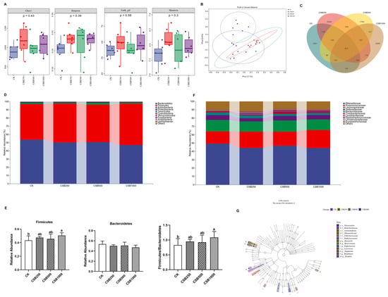 Effects of CSB supplementation on the gut microbiota compositions in broilers. (A) Variations in α diversity. (B) PCoA analysis. (C) Venn diagram summarizing the numbers of ASVs in the cecal microorganisms. (D) Microbiota composition analysis at the phylum level. (E) Relative abundance of Firmicutes and Bacteroidetes. (F) Microbiota composition analysis at the family level. (G) LEfSe analysis. n = 6 for each group. a,b Means with different letters indicate statistically significant differences (p < 0.05).