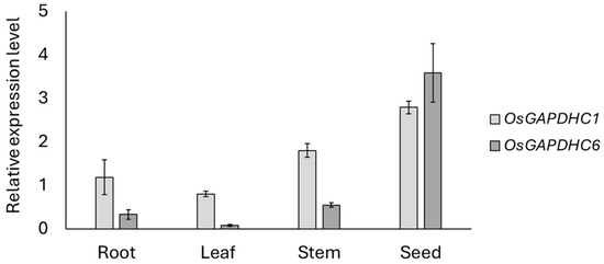 The OsGAPDHC1 (LOC_Os02g07490) and OsGAPDHC6 (LOC_Os06g45590) used in this study belonged to the cytosolic GAPDH group and were located very close in phylogenetic tree analysis [31]. In this study, the phylogenetic analysis of OsGAPDHC genes showed that OsGAPDHC1 and OsGAPDHC6 were located very closely, with values of 0.087 and 0.082, respectively (Supplemental Figure S1A). In addition, multiple alignment and gene structure analysis of the amino acid sequences of OsGAPDHC1 and OsGAPDHC6 showed that the NAD-binding domain and C-terminal domain were well conserved (Supplemental Figures S1B and S2A,B). qRT-PCR analysis was performed to determine the expression levels of OsGAPDHC1 and OsGAPDHC6 in the organs of rice plants (Figure 1). The expression levels of OsGAPDHC1 and OsGAPDHC6 were very high in seeds and lowest in leaves. In general, OsGAPDCH1 showed higher expression levels than OsGAPDHC6, but the level of OsGAPDHC6 was higher in seeds. Therefore, OsGAPDHC1 and OsGAPDHC6 had different expression levels compared to our previously reported organ-specific expression levels [31]. The expression levels of both genes were higher in the early germination stage compared to the reproductive stage (Figure 1).