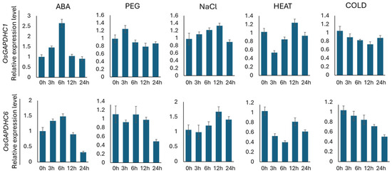 The analysis of the expression levels of OsGAPHDC1 and OsGAPHDC6 gene in seeds under abiotic stress (ABA, PEG, NaCl, heat, cold) conditions. The values 0 h, 3 h, 6 h, 12 h, and 24 h represent the treatment time for each abiotic stress. The 0 h samples of each abiotic stress condition were used as standards. Error bars represent the standard deviation calculated from three repetitions (mean ± SD, n = 3).