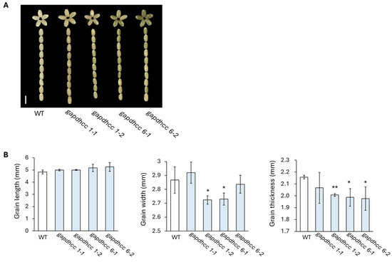 T1 seeds were harvested from four lines (gapdhc 1-1, gapdhc 1-2, gapdhc 6-1, and gapdhc 6-2) edited with the homo and bi-allelic selected in this experiment. In our experiment, the expression levels of OsGAPDHC1 and OsGAPDHC6 genes within the seeds were significantly different (Figure 1). Therefore, when examining the phenotypes of KO mutant seeds, we found that they showed large differences in grain length, grain width, and grain thickness in each KO line (Figure 4). Specifically, the thickness of the seeds tended to decrease in all lines, and the width of the seeds decreased, except for in the gapdhc 1-1 line (Figure 4B).