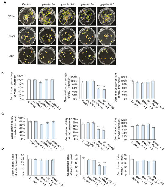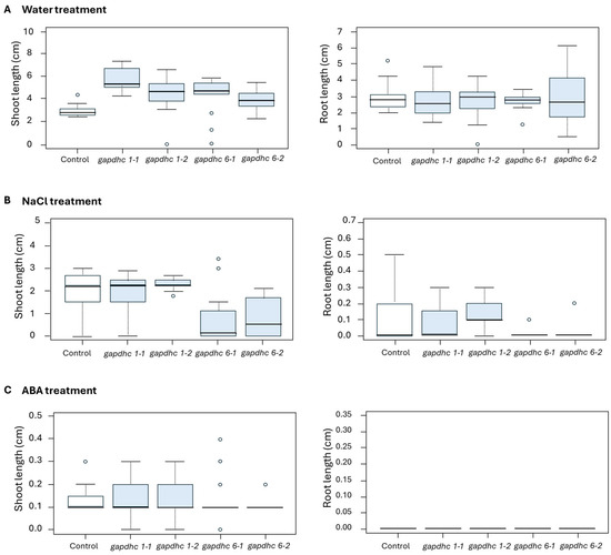 Seed germination experiments were conducted on each of the four selected KO lines using a solution containing water, 200 mM NaCl, and 100 μM ABA. The germination rate, germination power, and germination index were examined daily for 10 days from the start date, and finally, the shots and roots lengths were examined. The germination rate, germination ability, and germination index of all the lines examined in the water and ABA treatment showed almost similar results. However, in the NaCl treatment, the germination rate, germination ability, and germination index of the gapdhc 6-1 and gapdhc 6-2 lines were very low compared to the WT (Figure 5). In addition, in the shoot and root lengths of the gapdhc 6-1 and gapdhc 6-2 lines of the NaCl treatment, significant differences were confirmed compared to the control, gapdhc 1-1, and gapdhc 1-2 lines (Figure 6). Therefore, the gapdhc 6-1 and gapdhc 6-2 lines showed a sensitive response to salt.