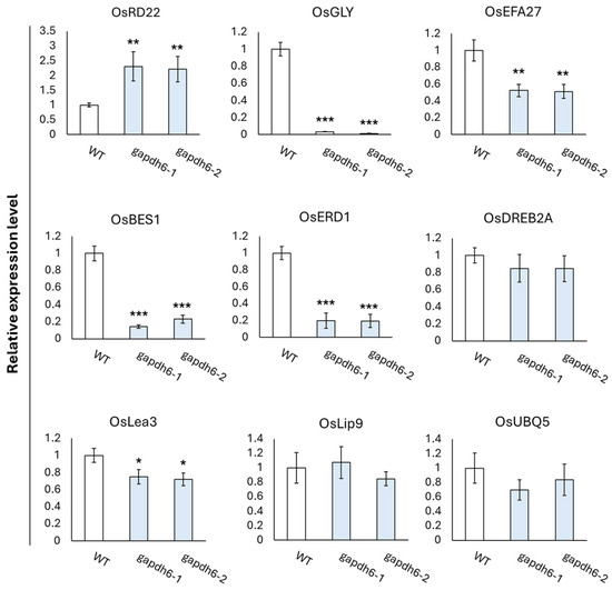 In the germination experiment, the gapdhc 6-1, gapdhc 6-2, and WT plants were transferred tp pots and then the recovery process was carried out through water treatment for 15 days. The leaves of each seedling were sampled to examine the dynamics of stress reactants. The DAB staining of leaf disks of the gapdhc 6-1 and gapdhc 6-2 lines showed a marked difference at 3, 12, and 24 h compared to the WT. Therefore, the leaves of the gapdhc 6-1 and gapdhc 6-2 lines showed a sensitive reaction following NaCl treatment, considering that NaCl treatment easily led to cell death and a darker color was observed (Figure 7A). In addition, the ROS substance content in each leaf was measured, and the gapdhc 6-1 and gapdhc 6-2 lines accumulated very high levels of H2O2 and MDA compared to the WT (Figure 7B). The proline content of gapdhc 6-1 and gapdhc 6-2 lines was lower than that of WT, and the chlorophyll content was also slightly reduced. Therefore, we analyzed the expression levels of nine stress-responsive genes in gapdhc 6-1 and gapdhc 6-2 lines using qRT-PCR analysis. As a result, the gene expression levels of OsGLY, OsEFA27, OsBES1, OsERD1, and OsLea3 were decreased in gapdhc 6-1 and gapdhc 6-2 lines compared to WT. On the other hand, the expression level of OsRD22 was higher in the mutant lines than in WT (Figure 8).