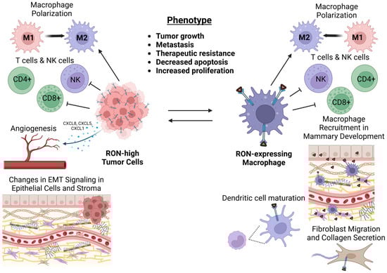 Crosstalk between RON-expressing tumor cells and macrophages enables a pro-tumor, immunosuppressive microenvironment. RON expression in cancer cells models the tumor microenvironment through regulation of immune populations as well as promotion of stromal remodeling and angiogenesis. RON expression in macrophages is critical in supporting tumor cell-intrinsic phenotypes and in supporting pro-tumor immune regulation. The crosstalk between tumor cells and macrophages enabled by RON promotes enhanced cancer cell growth, metastasis, and therapeutic resistance.