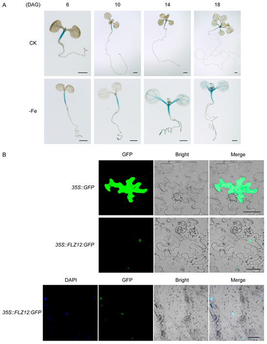 Expression pattern and subcellular localization of FLZ12. (A) Expression pattern of PROFLZ12::GUS in transformed Arabidopsis plants. Seedlings were grown on normal (CK) and Fe-deficiency (-Fe) conditions for 6, 10, 14, and 18 days, respectively. DAG, days after the start of germination. Scale bar, 1 cm. (B) Subcellular localization of 35S::FLZ12::GFP in N. benthamiana leaves. Scale bar, 50 µm. DAPI, 4′,6-diamidino-2-phenylindole; GFP, green fluorescent protein.